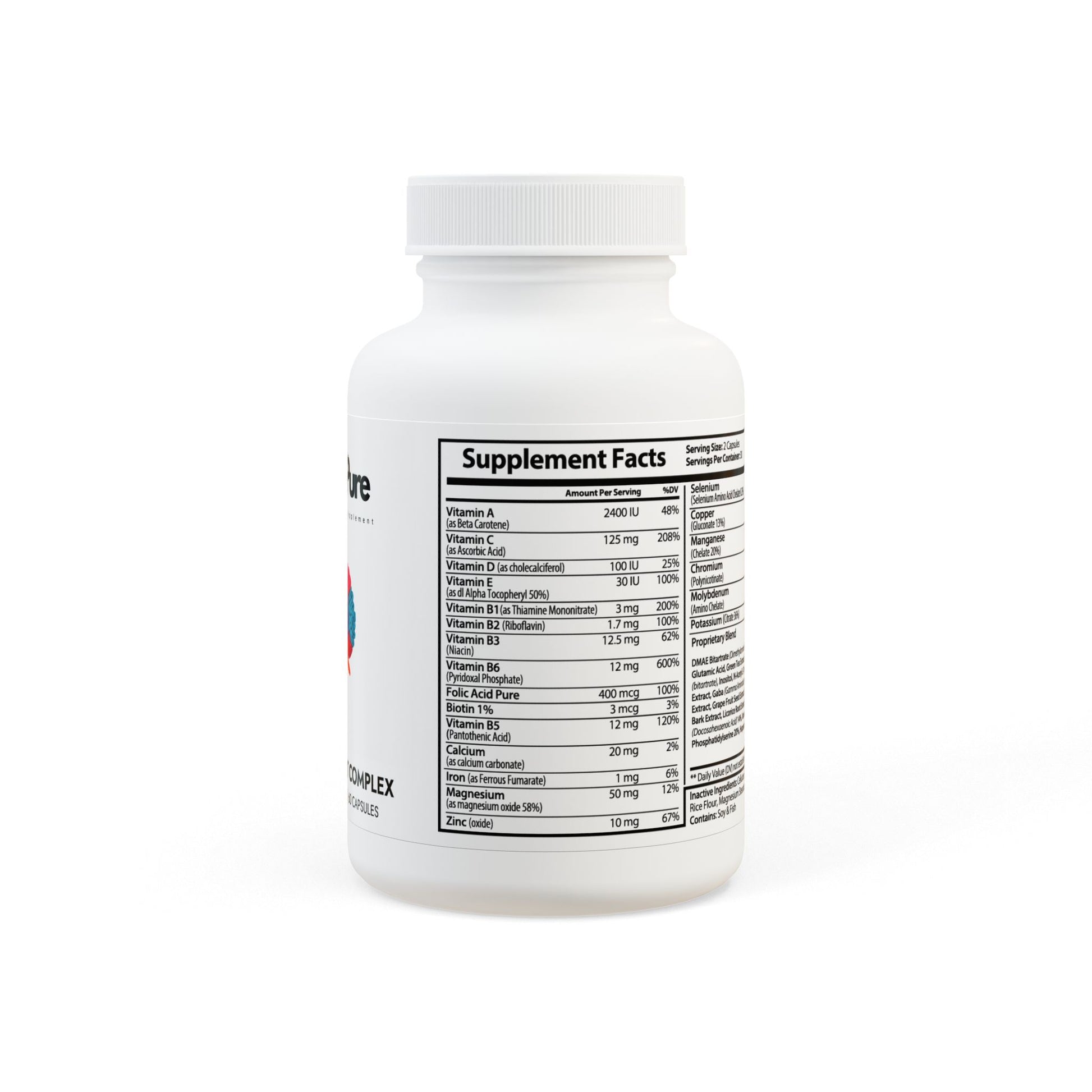Ingredients: Vitamin A (as Beta Carotene), Vitamin C (as Ascorbic Acid), Vitamin D (as cholecalciferol), Vitamin E (as dl Alpha Tocopheryl 50%), Vitamin B1(as Thiamine Mononitrate), Vitamin B2 (Riboavin), Vitamin B3 (Niacin), Vitamin B6 (Pyridoxal Phosphate), Folic Acid Pure, Biotin, Vitamin B5 (Pantothenic Acid), Calcium (as calcium carbonate), Iron (as Ferrous Fumarate), Magnesium (as magnesium oxide 58%), Zinc (oxide), Selenium (Selenium Amino Acid Chelate 0.2%), Copper (Gluconate 13%), Manganese (Chelate 20%), Chromium (Polynicotinate), Molybdenum (Amino Chelate), Potassium (Citrate 36%), DMAE Bitartrate (Dimethylaminoethanol), L Glutamine, Glutamic Acid, Green Tea Extract, Bacopa Extract, Choline (bitartrate), Inositol, N-Acetyl L-Tyrosine, Bilberry Fruit Extract, Gaba (Gamma Aminobutyric Acid), Grape Seed Extract, Grape Fruit Seed Extract, Olive Leaf, Cinnamon Bark Extract, Licorice Root Extract, Boron (Citrate), DHA (Docosahexaenoic Acid) 14%, Vanadyl Sulfate 19%, Phosphatidylserine 20%, Huperzine A. Inactive Ingredients: Cellulose (Vegetable Capsule), Rice Flour, Magnesium Stearate, Silicon Dioxide. Contains: Soy & Fish